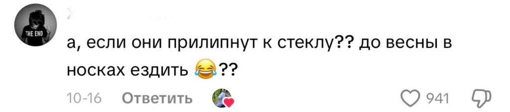Помимо ответных приколов, в сети всерьез начали переживать о том, что в одних и тех же носках придется ездить всю зиму, если они вдруг прилипнут к зеркалу после дождя и заморозков! Разумеется, тоже в шутку.