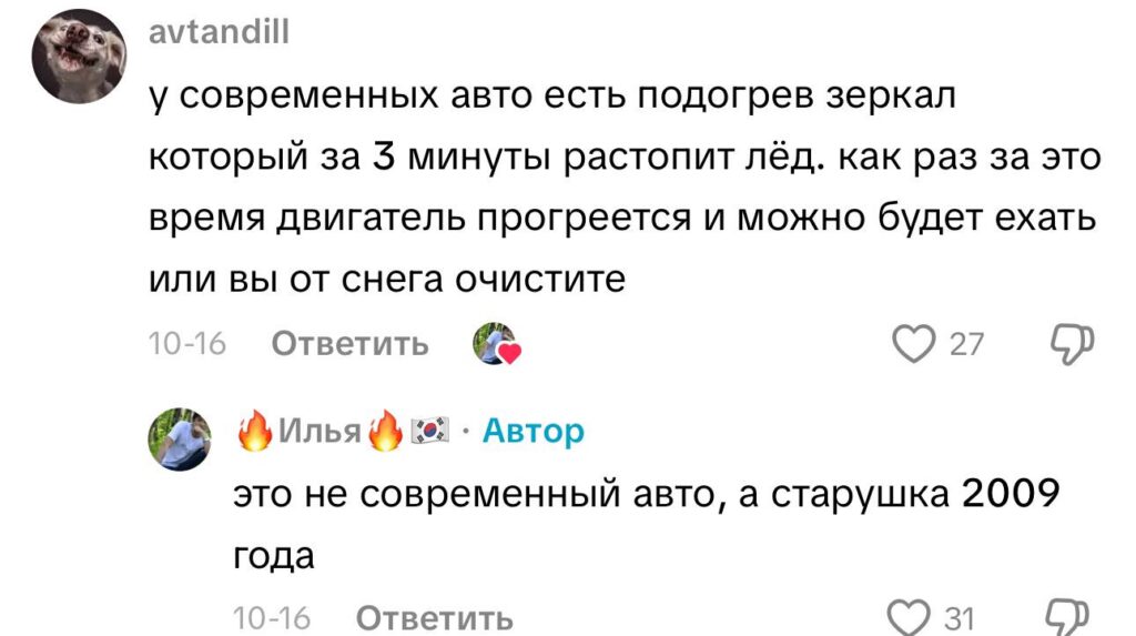 «В современных авто есть подогрев зеркал, который за 3 минуты растопит лед. Как раз за это время двигатель прогреется и можно будет ехать или вы от снега очистите», — резонно писали зрители. И они, конечно, правы!