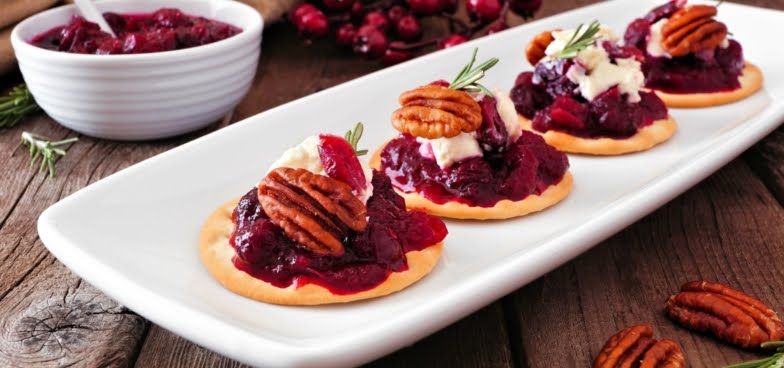 - Остывший клюквенный соус аккуратно разложите по крекерам. Сверху добавьте кусочки сыра, орехи и украсьте веточкой розмарина.
