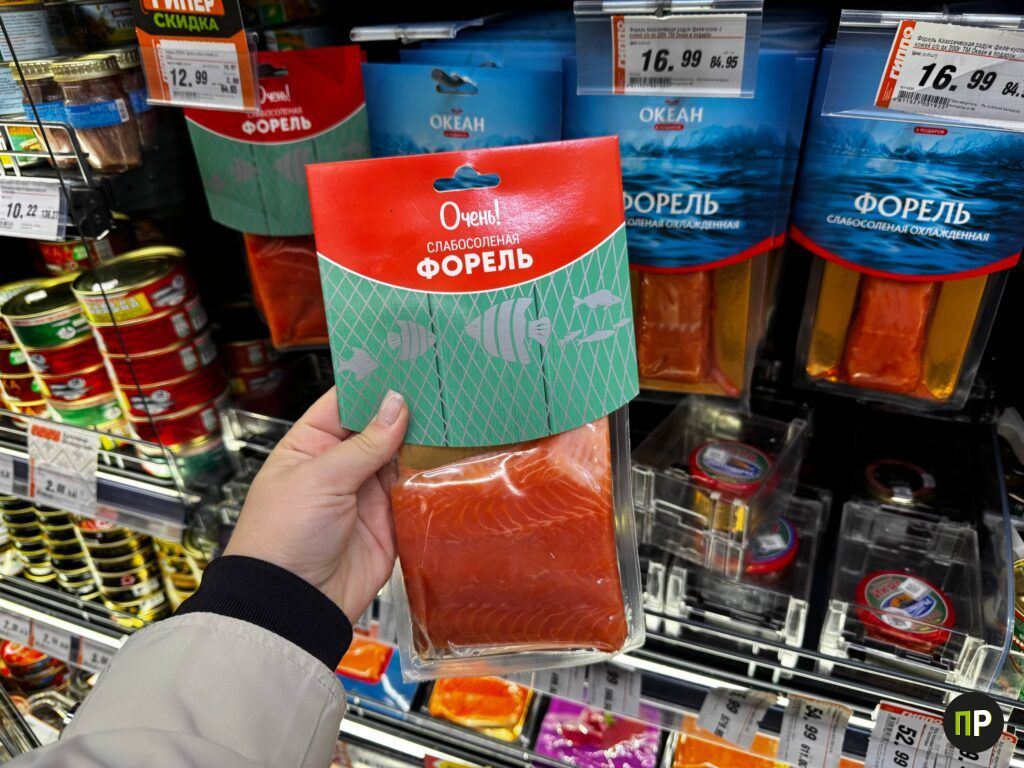 Но главную находку мы обнаружили в морозильной акционной полке. Форель радужная, непотрошеная, продается по цене 24,99 рубля за килограмм. Средний вес такой рыбки — около 1 килограмма. Это самое выгодное предложение из всех, что мы видели.