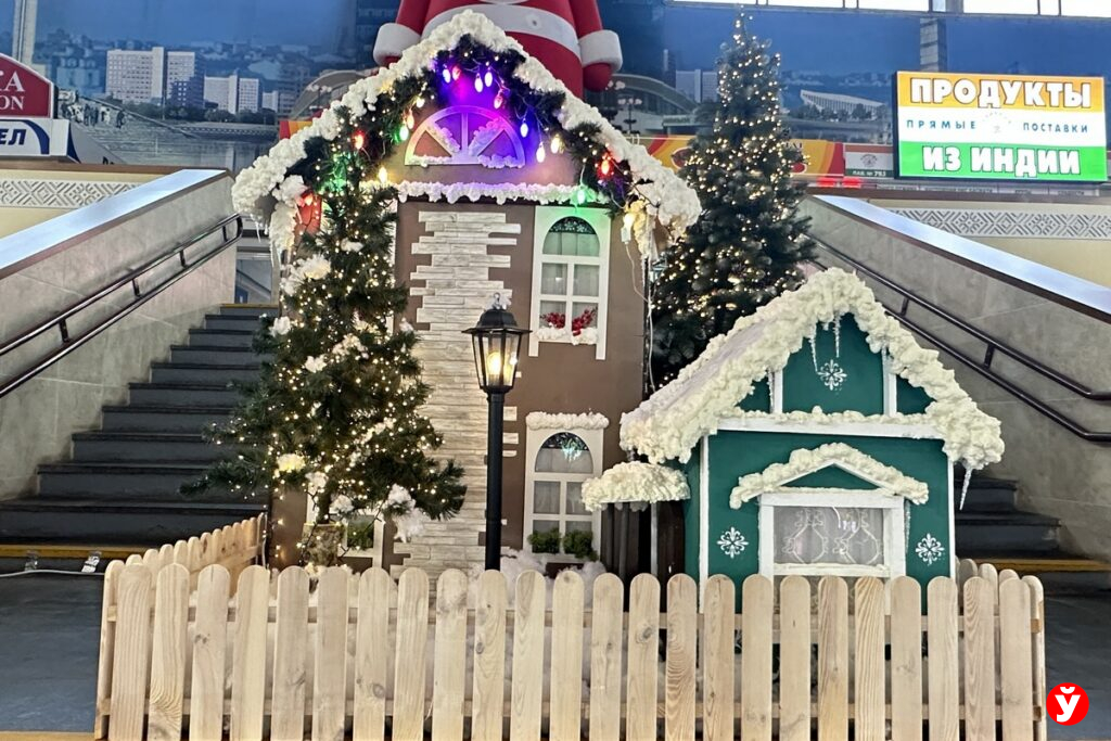 Комаровский рынок уже принарядился к праздникам: искрятся огоньки, выстроились в ряд уютные домики, застыли в веселых позах фигурные персонажи. Пространство приобретает праздничный облик и наполняется ожиданием чуда.