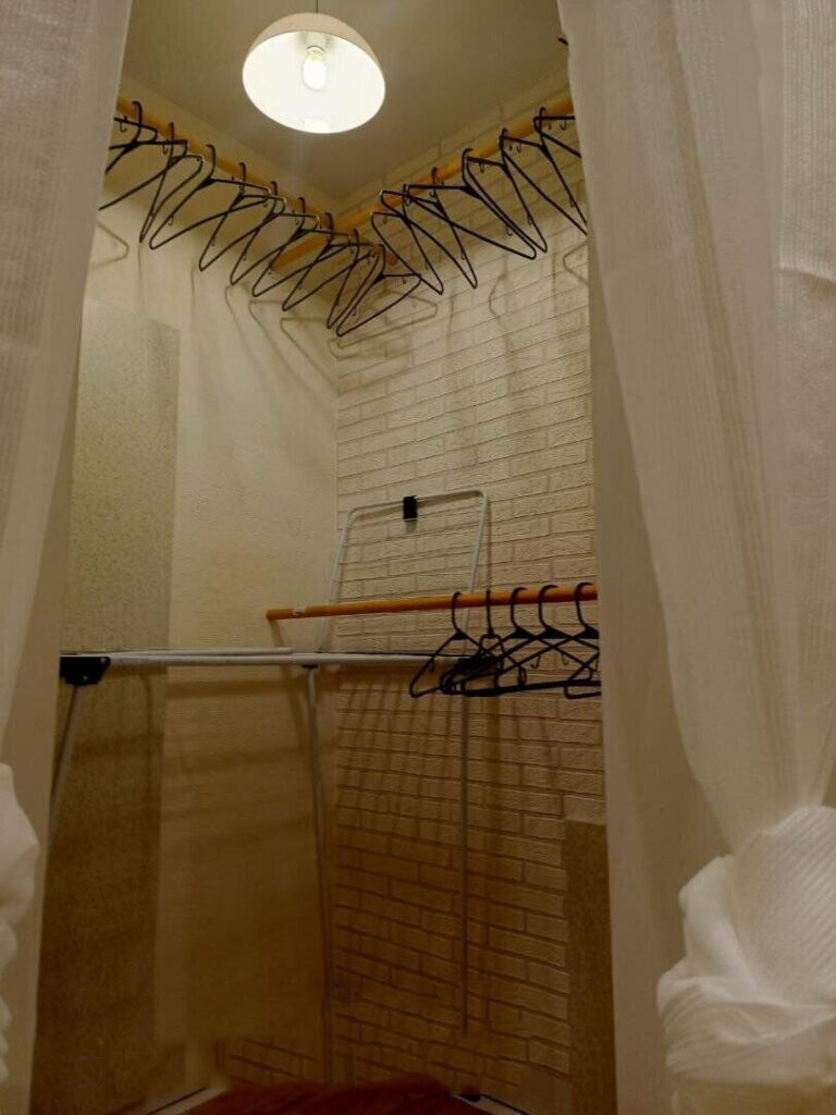 Жилая зона совмещена с кухней, где, несмотря на скромные метры, имеется вся необходимая техника. В квартире большое изобилие “мягкого” декора — пледов, пуфов, дивана и ковров с ворсом наружу, что создает уютную и теплую атмосферу и украшений из натуральных материалов — дерева и соломы. В квартире много декоративных растений в горшках и “висячей лозы”. Даже у входной двери имеется искуственная “живая” изгородь. Гардеробный уголок отделен тканевыми шторами.