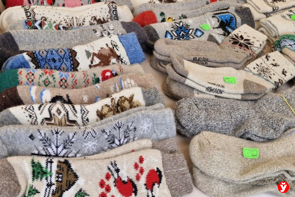 В торговых рядах можно было найти обилие новогодних и зимних аксессуаров: шапочки Деда Мороза, шерстяные носки со снегирями, новогодние украшения интерьера, полотенца с символом 2026 года — Лошадкой.