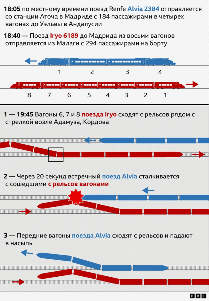 18 января произошла одна из самых страшных железнодорожных аварий в Испании: поезд Iryo, следовавший из Малаги в Мадрид, сошёл с рельсов недалеко от города Адамус (провинция Кордова) и выехал на встречную колею, по которой шёл состав Alvia. По данным властей, 45 человек погибли и более 150 пострадали. Точное число жертв может быть ещё выше, поскольку многие люди до сих пор находятся в критическом состоянии в реанимациях.