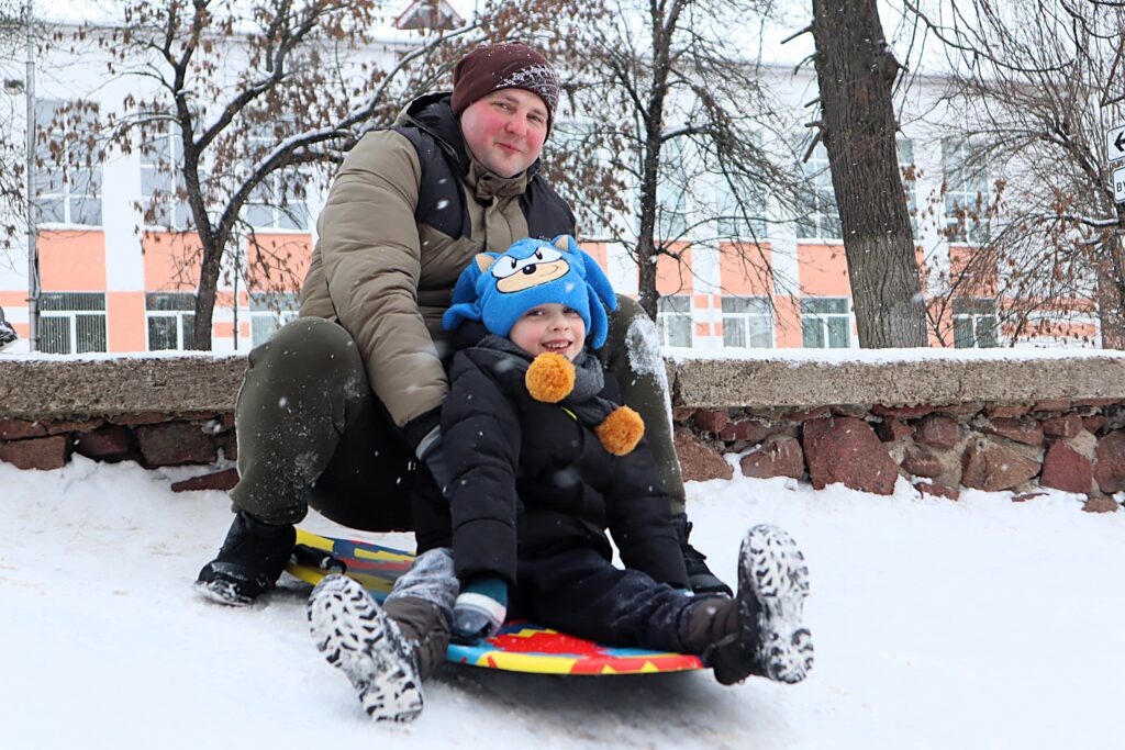 Андрей катается со снежной горки с сыном Даником. И ещё большой вопрос, кому эти покатушки больше нравятся — папе или сыну.