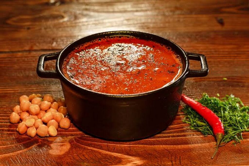 Этот суп сочетает в себе три источника красного цвета: благородную рыбу, сладкий перец и томатную пасту. Нут здесь выступает не просто дополнением, а важным текстуальным элементом, делающим блюдо исключительно сытным и питательным. Идеальный обед для морозного дня.