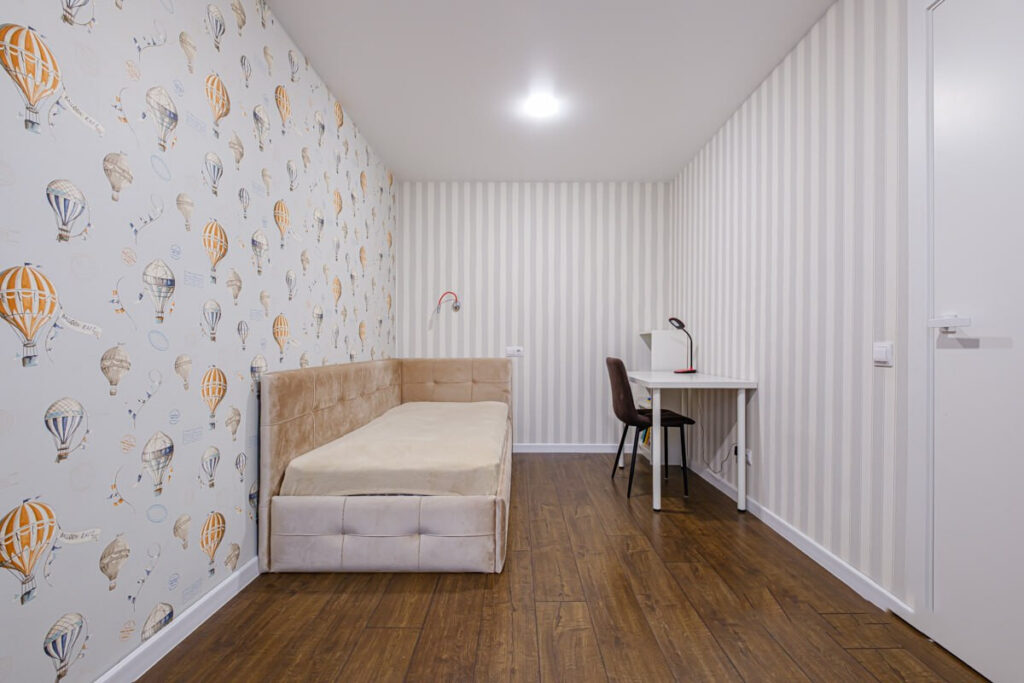 В одной из комнат, которая является проходной, в углу разместилась кровать. Здесь также осталось достаточно места для обустройства зоны для отдыха. Из этой комнаты есть выход на балкон. Вторая комната изолирована и идеально подходит для детской, где также предусмотрено рабочее место.