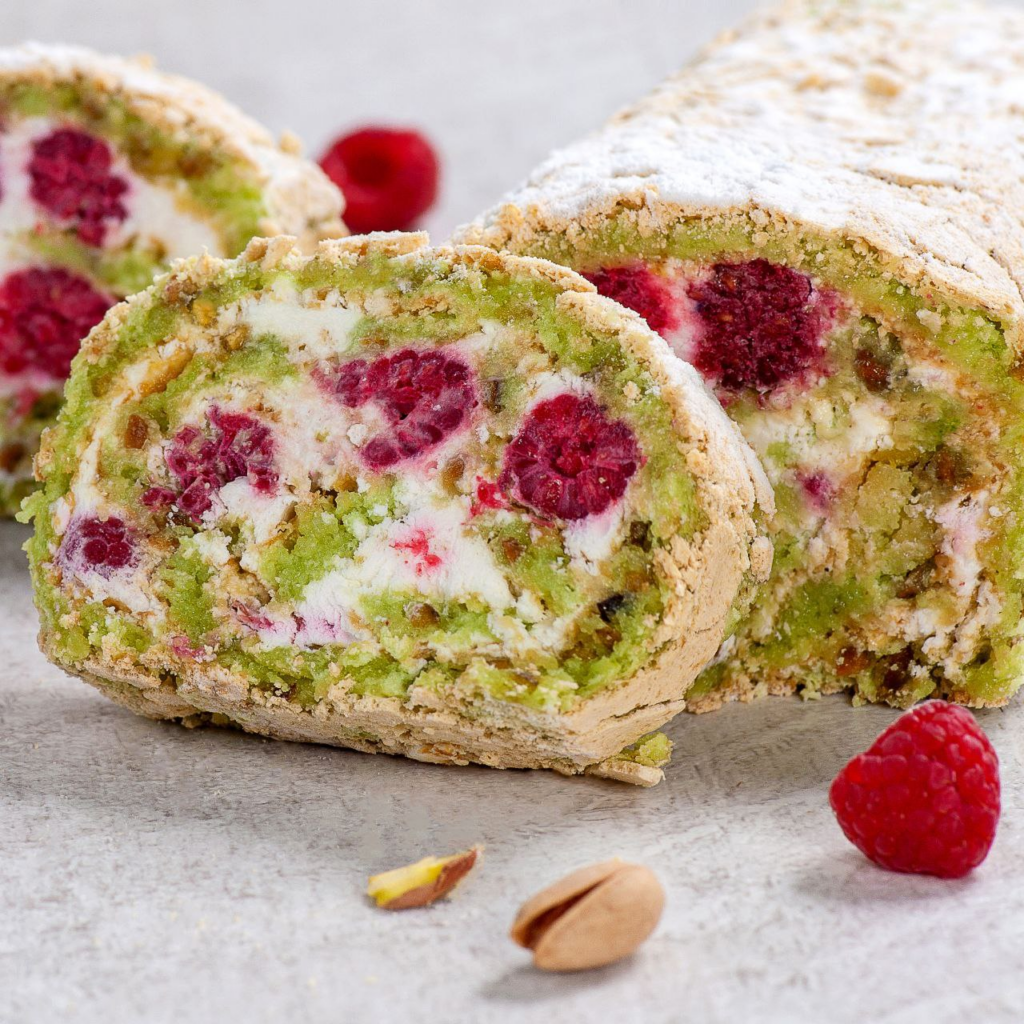 - Остывший корж смазываем кремом, посыпаем оставшимися рублеными фисташками и ягодами малины. Плотно сворачиваем рулет, помогая себе бумагой. Убираем в холодильник минимум на час для стабилизации. Перед подачей можно присыпать пудрой и украсить свежими ягодами.