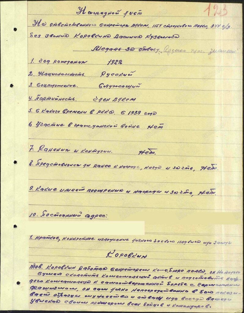 ** «Тов. Коровкин В. К. на фронтах Отечественной войны с 1941 года. В боях был ранен. Старшим инструктором комсомольского отделения работает с декабря 1943 года.