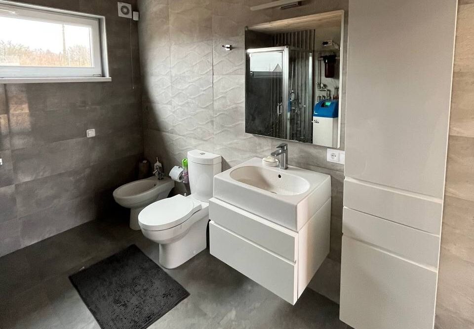 Для оформления интерьера владельцы выбрали функциональный скандинавский стиль, который отличается простотой и элегантностью. Потолки и стены окрашены в светлые тона, что делает помещения более просторными и светлыми. Отопление в доме электрическое, водоснабжение осуществляется от центральной системы, а канализация — местная. На кухне установлена система обратного осмоса для очистки воды, а в санузле — умягчитель.