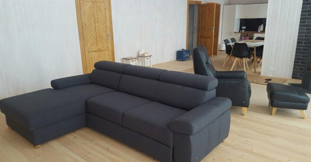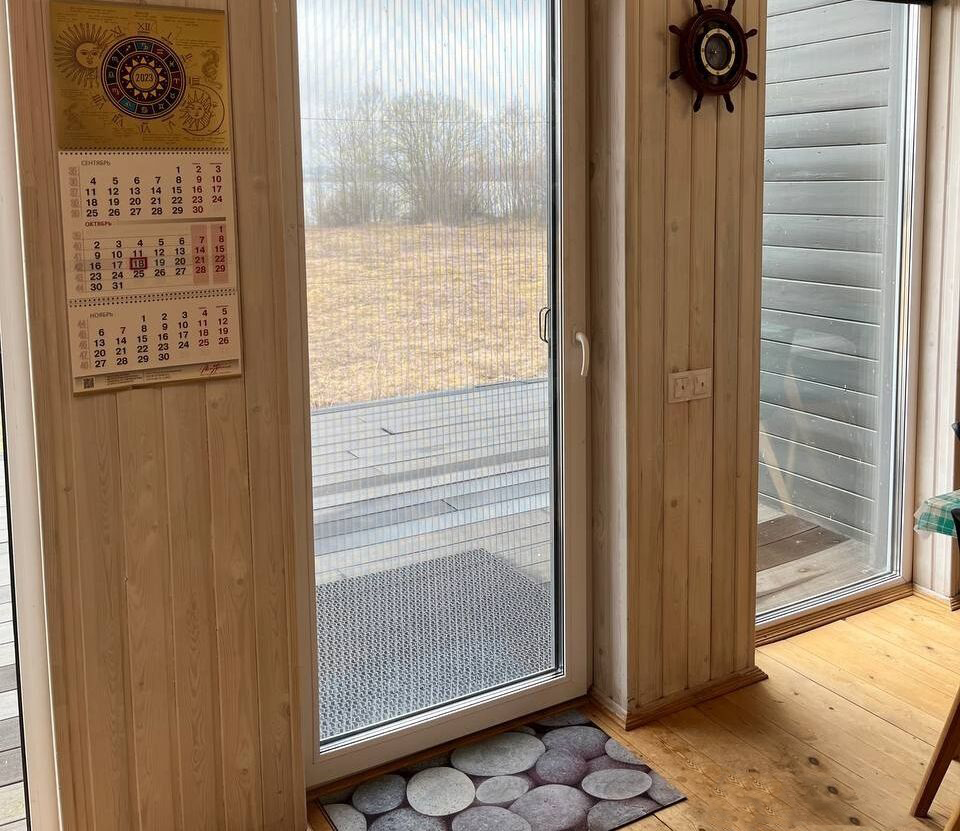 Планировка дома очень удобная: в прихожей предусмотрен шкаф-купе для хранения вещей, а просторная гостиная с камином на дровах и кондиционером. В доме также есть совмещенный санузел и две спальни, оформленные с использованием мебели из массива дерева, что добавляет интерьеру натуральности и тепла. Кухонная зона оборудована всей необходимой мебелью и бытовой техникой, включая встроенную кухню, посудомоечную машину, варочную поверхность, духовой шкаф и холодильник. Обязательная часть — обеденный стол со стульями.