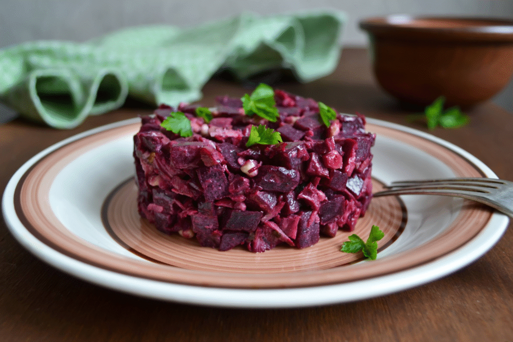 Сочетание нейтральной курицы, сладковатой свеклы и пикантной заправки создает сложную палитру вкусов. Изюминка этого салата – заправка из грецких орехов, горчицы, уксуса и меда, которая связывает все компоненты в единое целое.