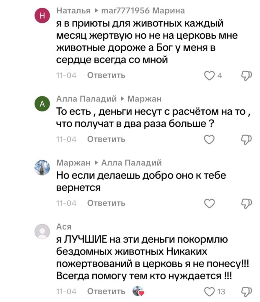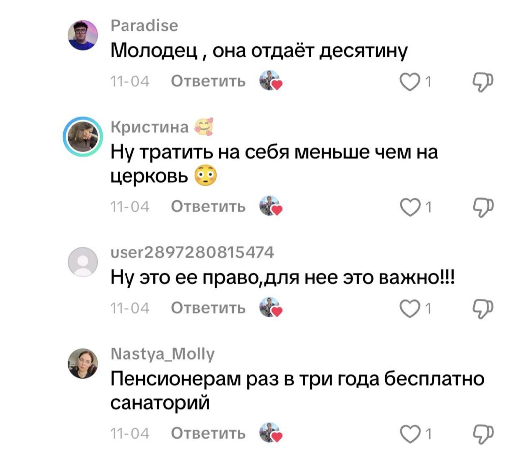 Но самое бурное обсуждение среди зрителей вызвала строка расходов. Кто-то отметил, что вместо пожертвований в церковь лучше бы отдать сумму на содержание бездомных животных. Другие же поддержали автора видео: «Молодец, она отдает десятину». Посыпались и советы, как можно оздоровиться пенсионеру и съездить, например, в санаторий.