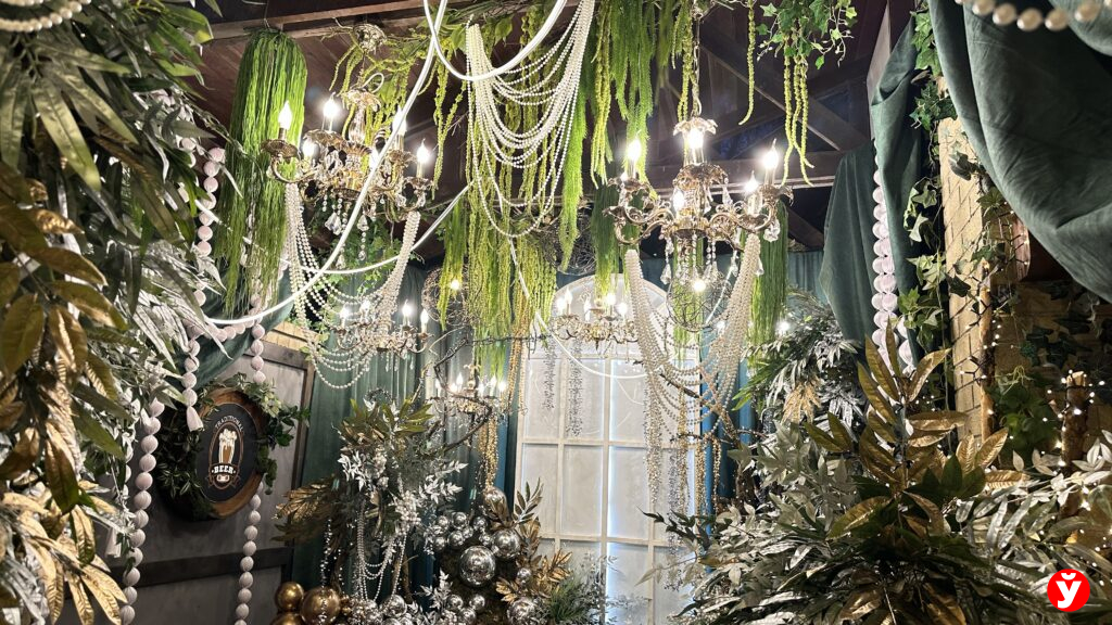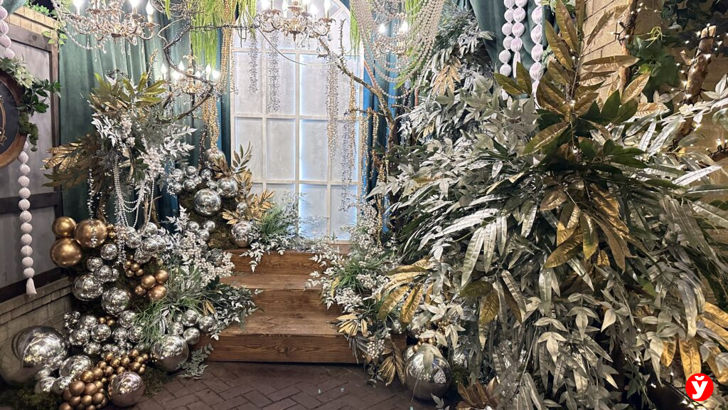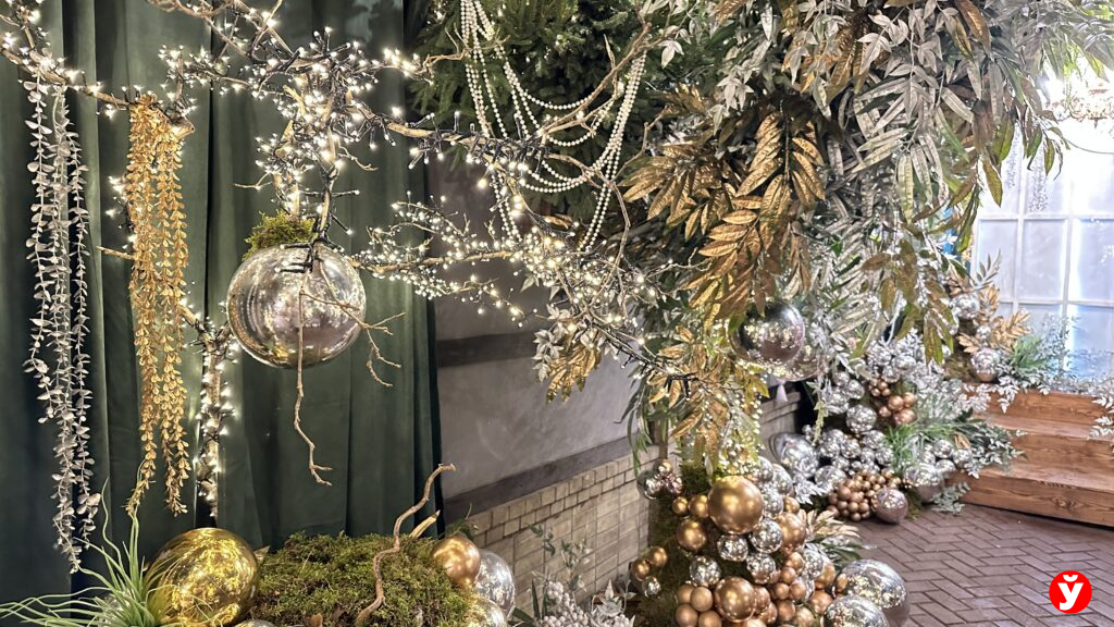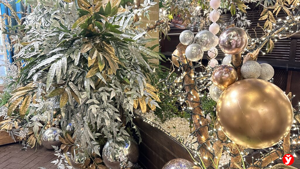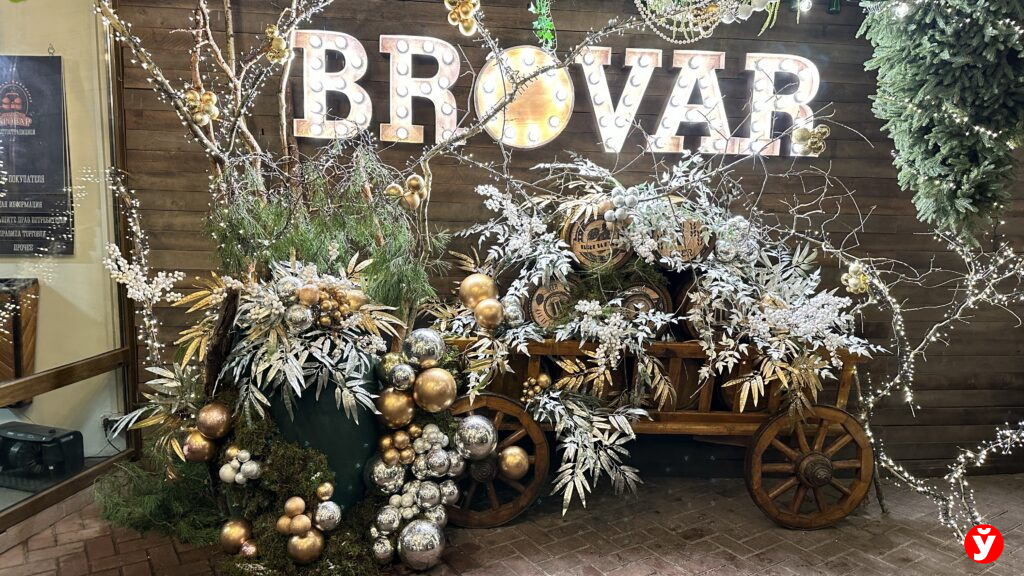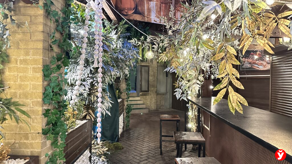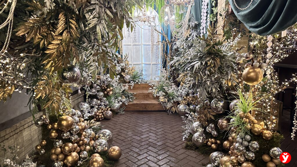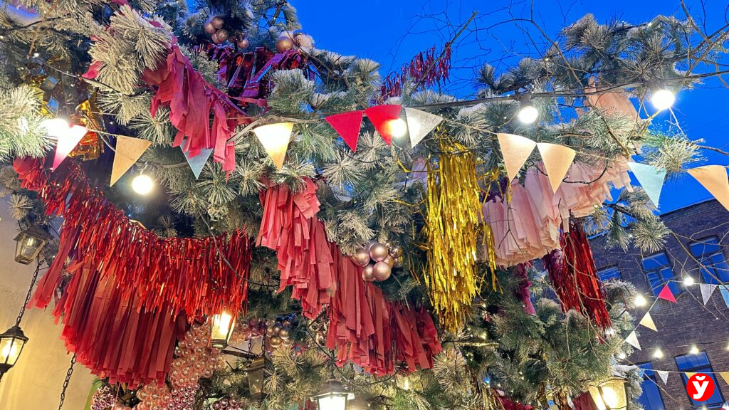 Вторая локация ждет посетителей на Витебской 10. Во дворике большого ресторана установили елки, развесили золотые шары и гирлянды.