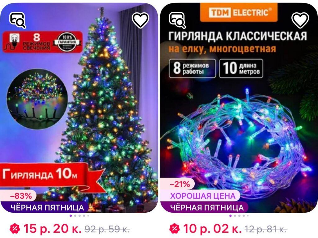 На маркетплейсе цены на гирлянды стартуют примерно от 15 рублей. Плюс в том, что за ними не придётся ехать на рынок, можно забрать заказ в пункте выдачи возле дома.