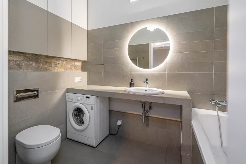 Санузел изначально был раздельным, но для увеличения пространства его решили объединить. В ванной комнате установлена стиральная машина, а также итальянская сантехника. Из жилой комнаты имеется выход на открытый балкон.
