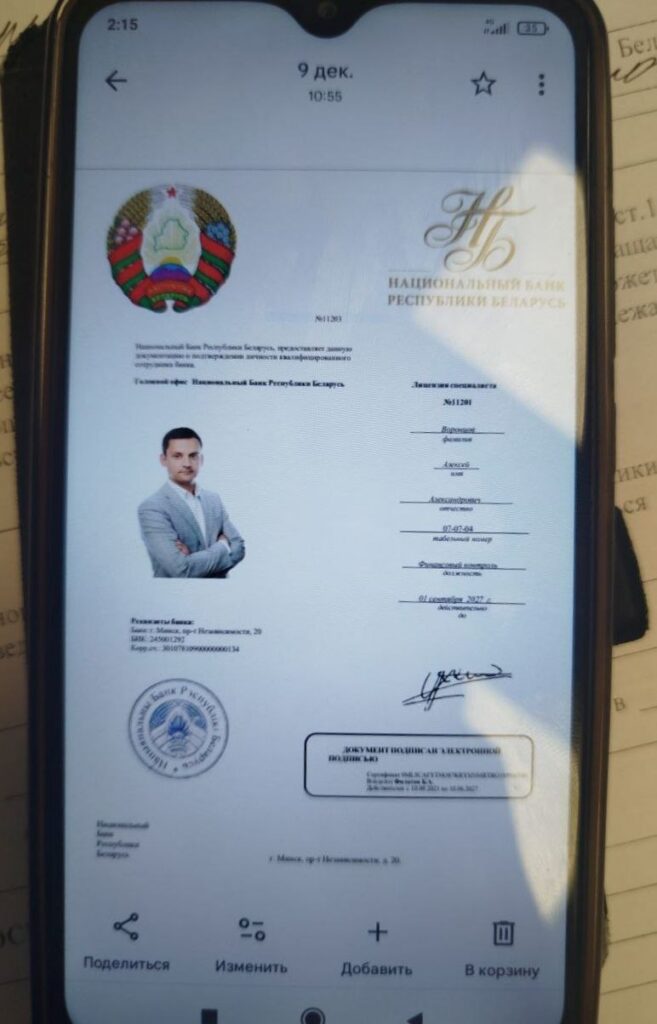 — Действительно, подключается еще один человек. Я-то уверена, что люди работают, отслеживают мою ситуацию, что происходит вообще. Подключается некто Герасимов, якобы юрист Нацбанка, и говорит: «Сейчас я вам пришлю свой документ, чтобы вы поверили, что я действительно сотрудник». Отправил удостоверение, выглядело оно реалистично, с фотографией. Но я откуда могу знать, как должен выглядеть настоящий документ? Нечасто сталкиваешься в жизни с такими организациями. Он сказал, что на мое имя оформлено два кредита. Я даже в тетрадке сумму записала: первый — 17 тысяч с чем-то, второй — более 14 тысяч. И он говорит, мол, все происходит очень-очень быстро — и эти деньги, то есть оформленные на меня кредиты, уже ушли за границу. Я очень испугалась.