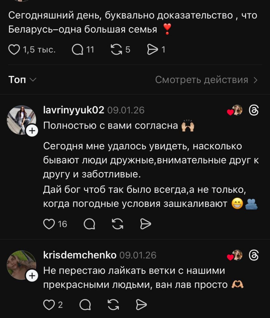 Но, пожалуй, самое теплое в этой ледяной истории — то, как люди ведут себя друг с другом. Пользователи отмечают: сегодня белорусы особенно внимательны и заботливы. Поддерживают прохожих, поднимают тех, кто упал, предупреждают о самых скользких местах, а иногда и просто идут, держась друг за друга, как старая добрая команда.