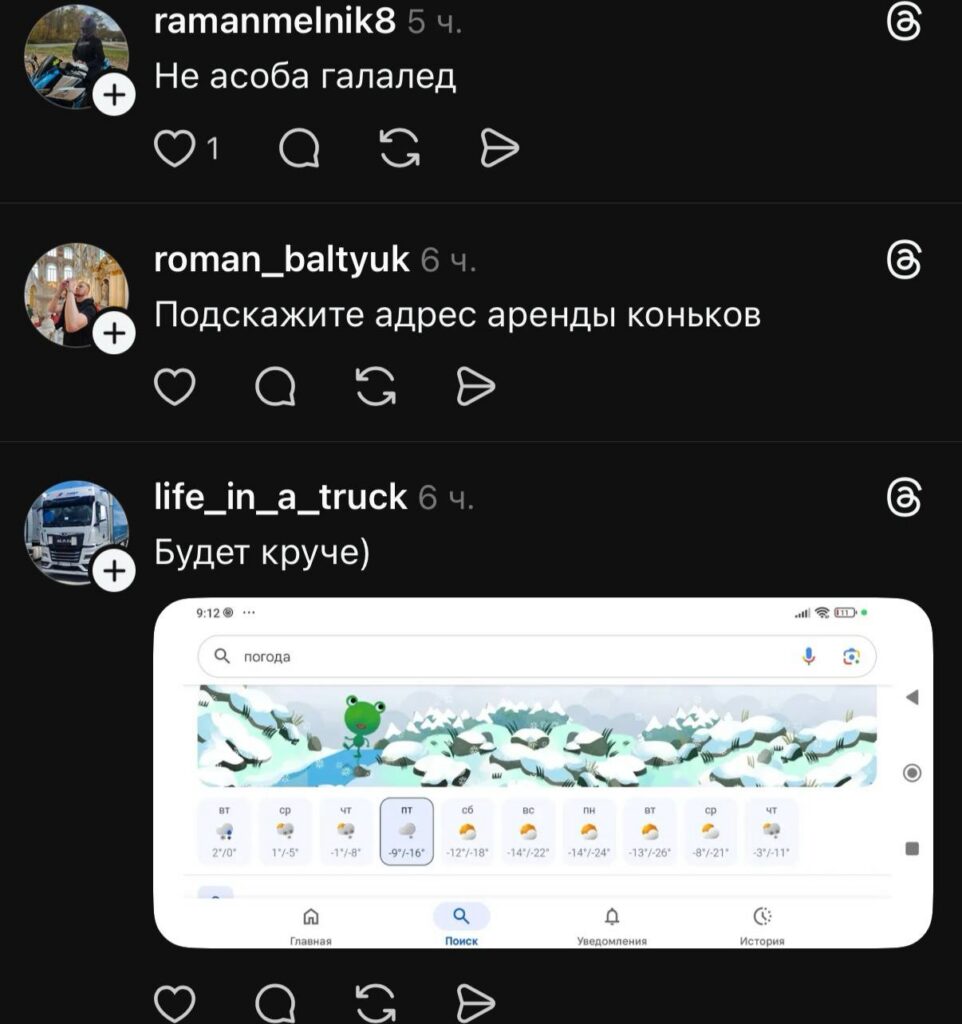 Отдельный жанр сегодняшнего утра — мемы. Картинки, видео, шутки про «фигурное катание по пути в офис» и «олимпийские нормативы по падениям» разлетаются с бешеной скоростью. Пользователи соревнуются не только в юморе, но и в самоиронии: в комментариях ведут почти бухгалтерский учет — кто сколько раз поскользнулся и где именно.
