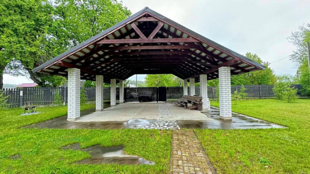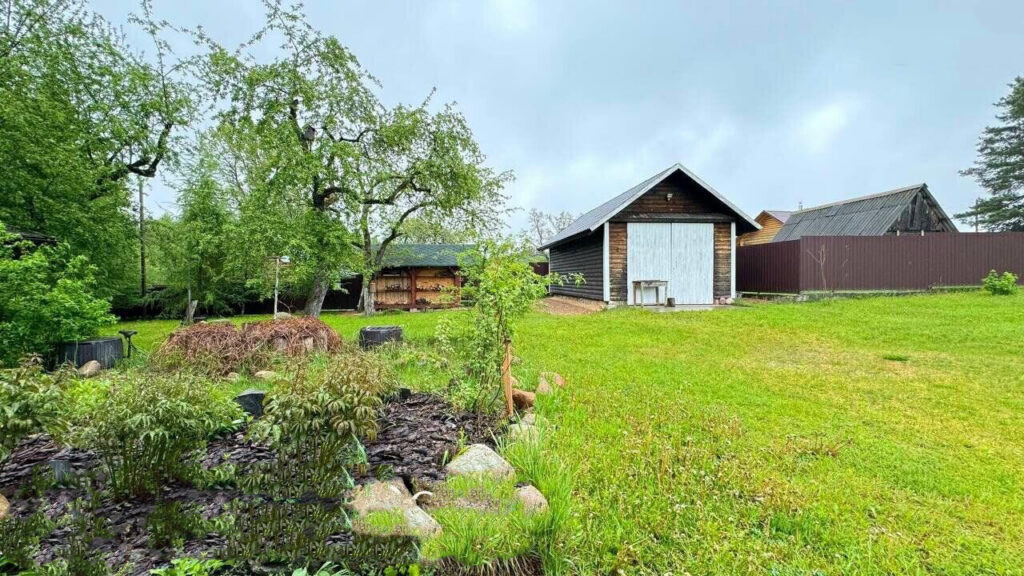 Участок, площадью 25 соток, полностью огорожен и обустроен для комфортного проживания. За въездными воротами имеется навес, вмещающий два автомобиля. На территории также расположены хозяйственные постройки, такие как погреб, сарай и дровница. Кроме того, здесь есть большая беседка с зоной для барбекю, с которой по бетонным ступенькам можно спуститься к реке для купания или рыбалки.