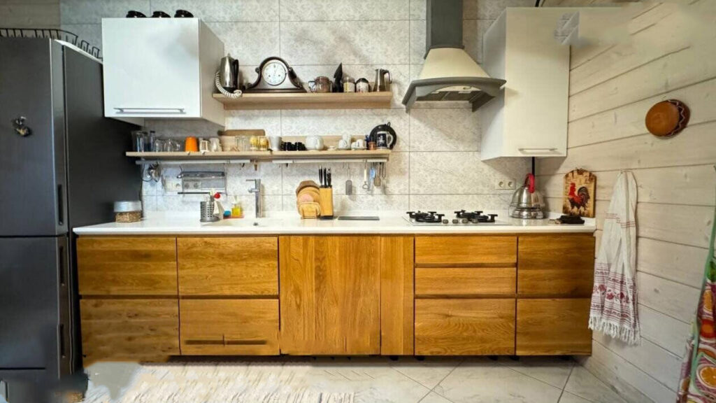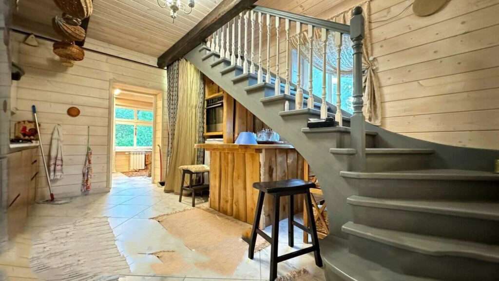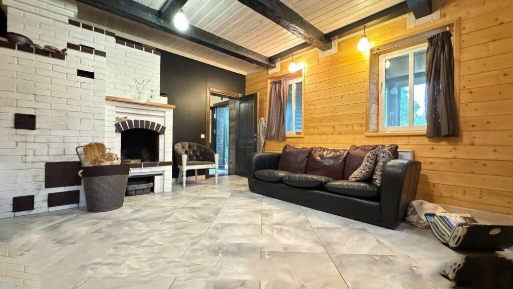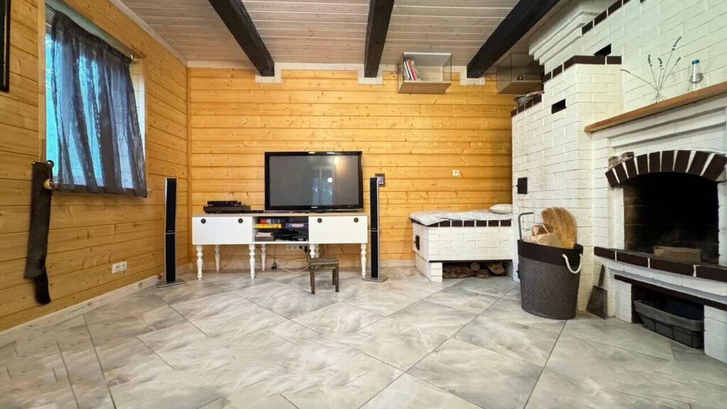 Общая площадь здания составляет 117,4 квадратных метра. Вход в дом осуществляется через уютную застекленную веранду. Проходя через веранду, можно сразу попасть в прихожую, где есть зеркальный шкаф и мебель, выполненная из массива сосны. Далее идет просторная гостиная, где установлен камин и настоящая печь с лежанкой. Рядом с гостиной располагается отдельная кухня, выполненная из массива дуба и сосны, которая полностью укомплектована встроенной техникой.