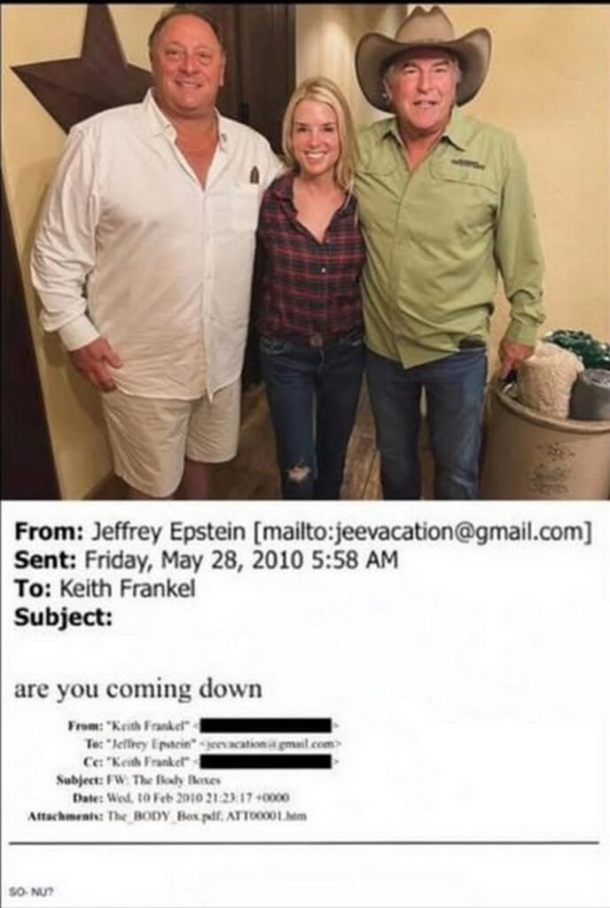 Но, быть может, справедливости можно добиться через самого генпрокурора? Однако, Пэм Бонди предпочитает уходить от вопросов журналистов. В подавляющем большинстве случаев засекречиваются имена и насильников, и жертв. Уголовные дела не возбуждают. В чем дело? Ответ прост: имя нынешнего генпрокурора тоже всплывает в файлах Эпштейна. В свое время она была прокурором в штате Флорида, где находится принадлежавший финансисту особняк. Есть фото, на котором она улыбается, обнявшись с Китом Франкелем. Последний делал пожертвования детскому дому, куда приводили детей из Одессы. Он 15 раз упоминается в файлах Эпштейна, в том числе с вопросом о «коробке для тела».