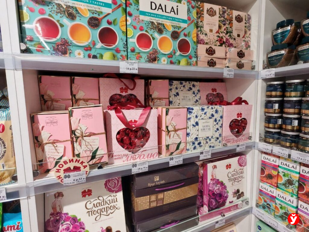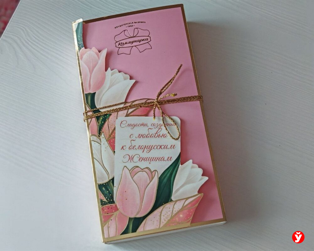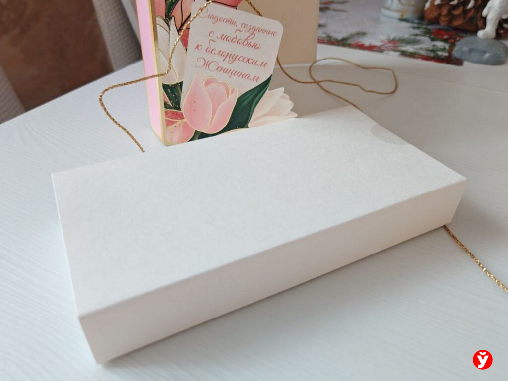 Оформление однозначно на 10 баллов. Небольшая коробочка в нежно-розовых тонах, перевязанная золотой тесьмой, тюльпаны — и многозначительная надпись о том, что содержимое подарка создано с любовью к белорусским женщинам. Ещё одно напоминание, что 2026-й посвящён и принадлежит нам, прекрасным и неповторимым.
