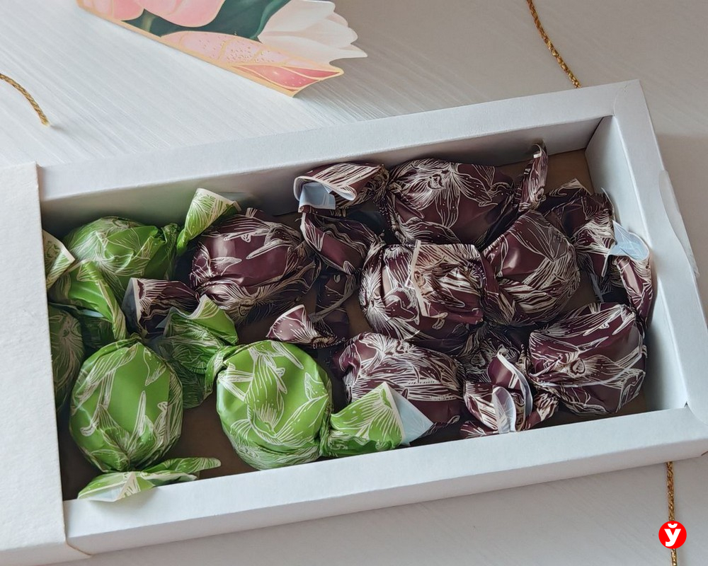 Из нарядной белой коробочки появляется ещё одна — наконец-то добралась до конфет. Ровно десять штук: шесть в коричневых фантиках и четыре в зеленых.