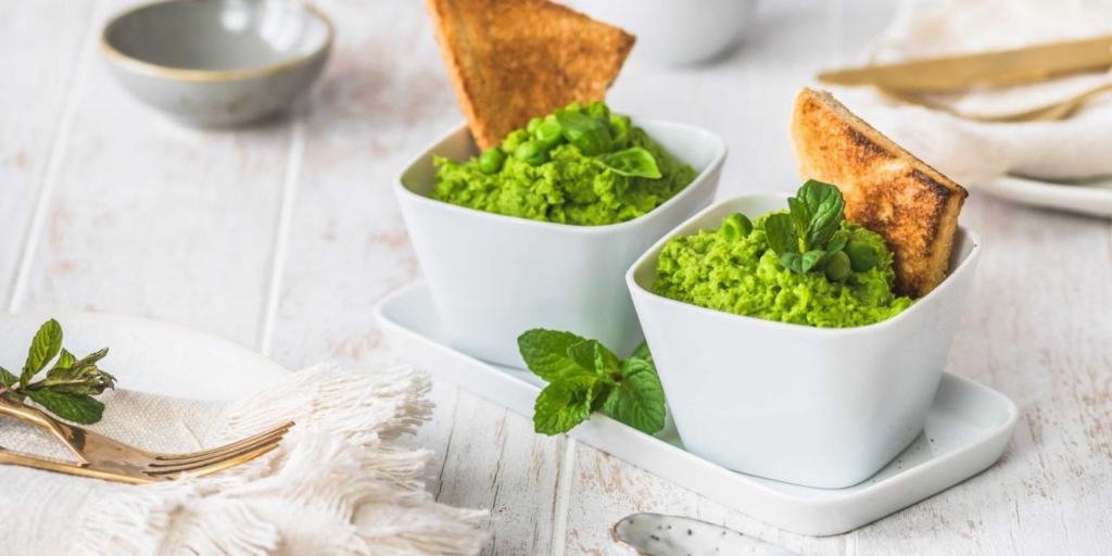 Шоковая заморозка гороха консервирует сахара, поэтому пюре из него всегда слаще и ярче, чем из свежего стручкового. Главный технологический трюк — минимальное время варки, чтобы хлорофилл не успел уйти в серый тон. Греческий йогурт дает сливочную кислинку и плотность, белый винный уксус — высокую ноту, а дуэт мяты и тархуна — эффект холодящей свежести.