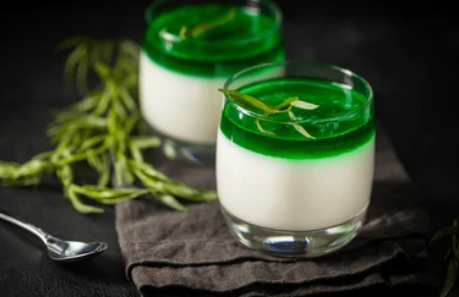- Поверх панна котты налейте тонкий слой желе из тархуна. Уберите в холодильник еще на 2-3 часа.