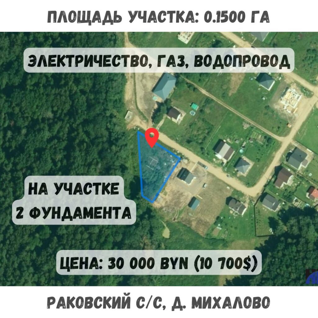 Участок площадью 0,15 га находится в деревне Михалово, пер. Полевой №3, 37. Удаленность от столицы — 33 км. На участке уже есть два фундамента. Подведены электричество, газ, водопровод.
