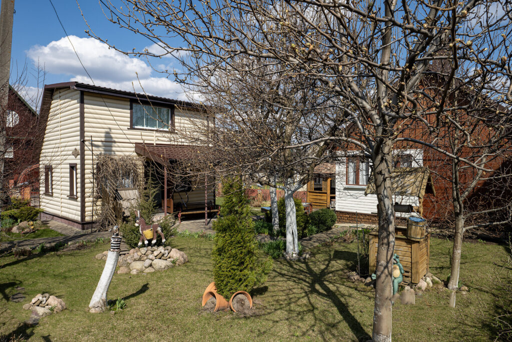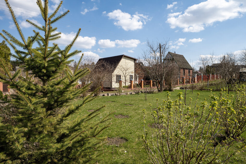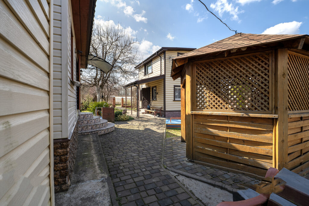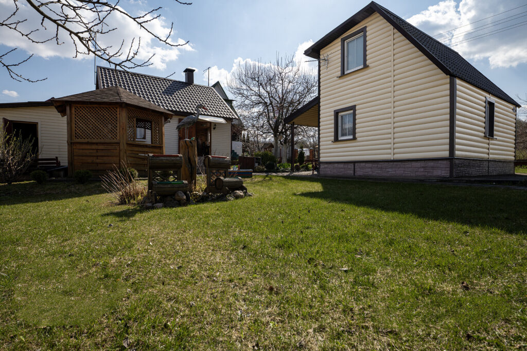 Участок, на котором расположен дом, небольшой — всего 4 сотки. Однако на нем уже высажены фруктовые деревья, такие как яблони и груши, а также виноград. По периметру участка растет декоративный виноград, который служит живой изгородью, создавая уютную атмосферу. На территории также есть баня, летняя кухня, беседка и различные хозпостройки.