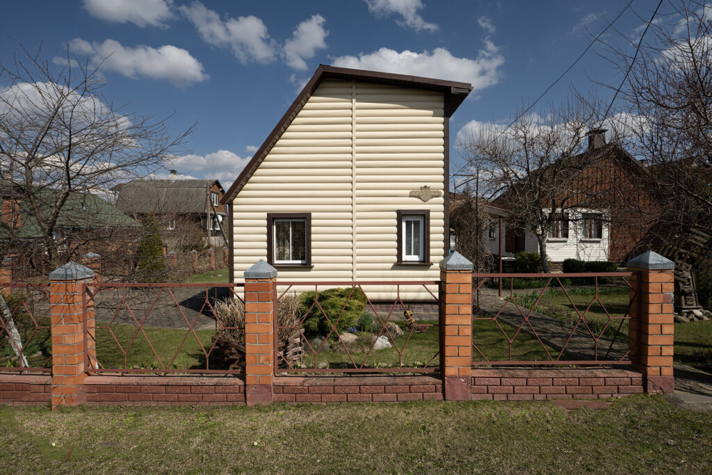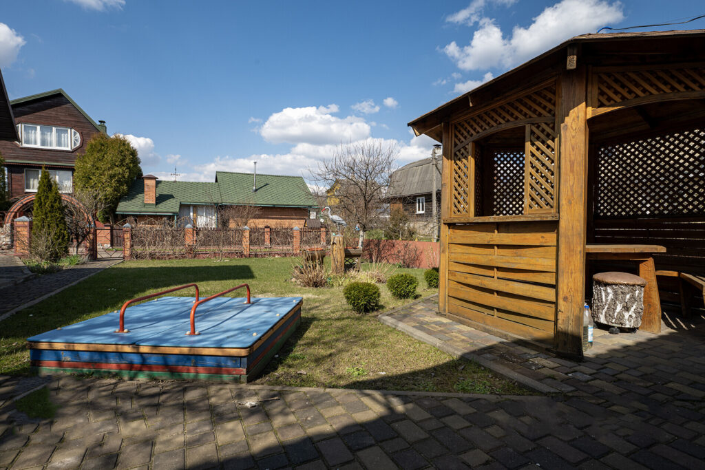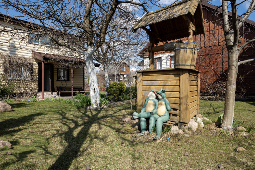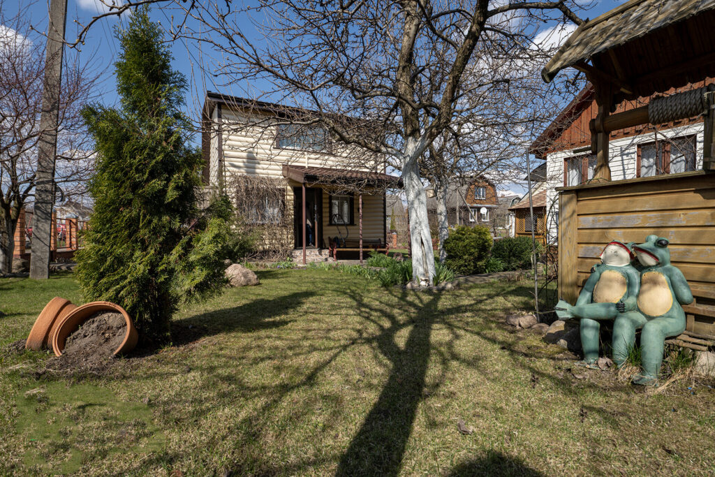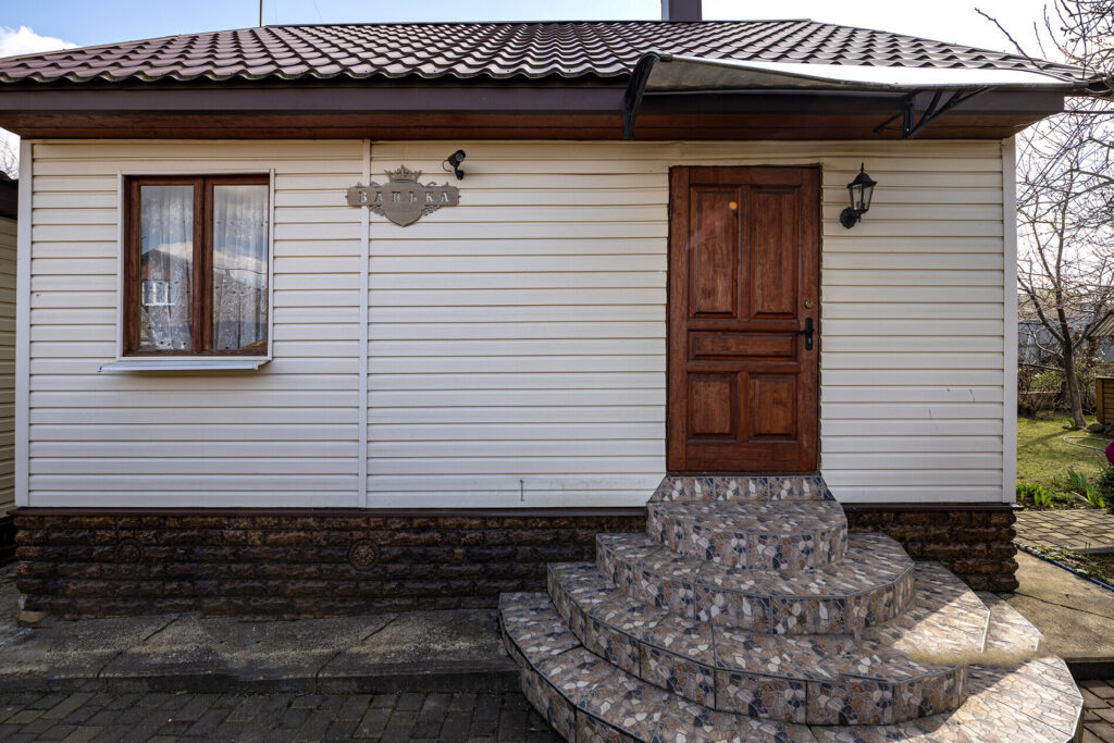 Участок, на котором расположен дом, небольшой — всего 4 сотки. Однако на нем уже высажены фруктовые деревья, такие как яблони и груши, а также виноград. По периметру участка растет декоративный виноград, который служит живой изгородью, создавая уютную атмосферу. На территории также есть баня, летняя кухня, беседка и различные хозпостройки.