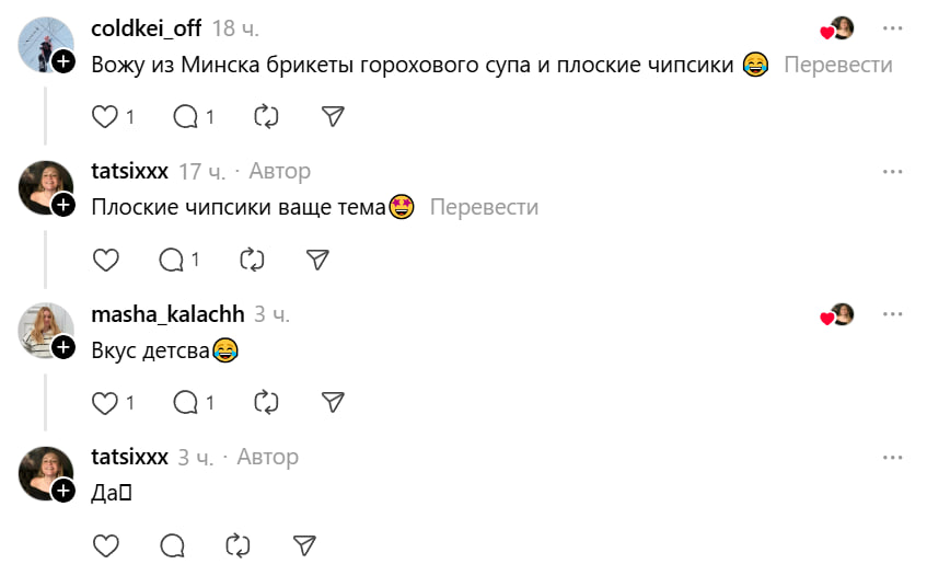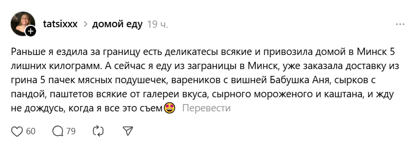 Ярким примером этого тренда стал пост одной из пользовательниц в Threads. Девушка с восторгом рассказала, что раньше привозила из-за рубежа «лишних 5 килограмм», а теперь, возвращаясь в Минск, заказала с доставкой целый набор белорусских вкусностей.