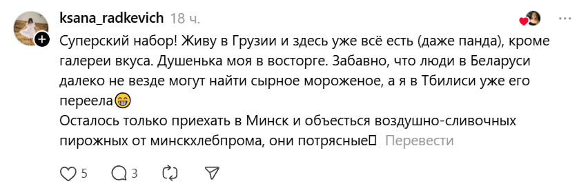 Ее тут же поддержали в комментариях, подтвердив, что такая «продуктовая ностальгия» — явление массовое. «Суперский набор! Живу в Грузии и здесь уже всё есть (даже панда), кроме галереи вкуса. Душенька моя в восторге… <…> Осталось только приехать в Минск и объесться воздушно-сливочных пирожных от минскхлебпрома, они потрясные», — написала другая девушка.