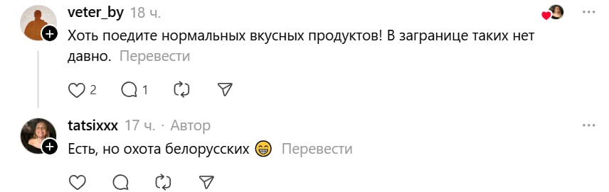Как и в любой дискуссии, не обошлось без споров. Насмешливый комментарий «Хоть поедите нормальных вкусных продуктов! В загранице таких нет давно» автор парировала просто: «Есть, но охота белорусских».