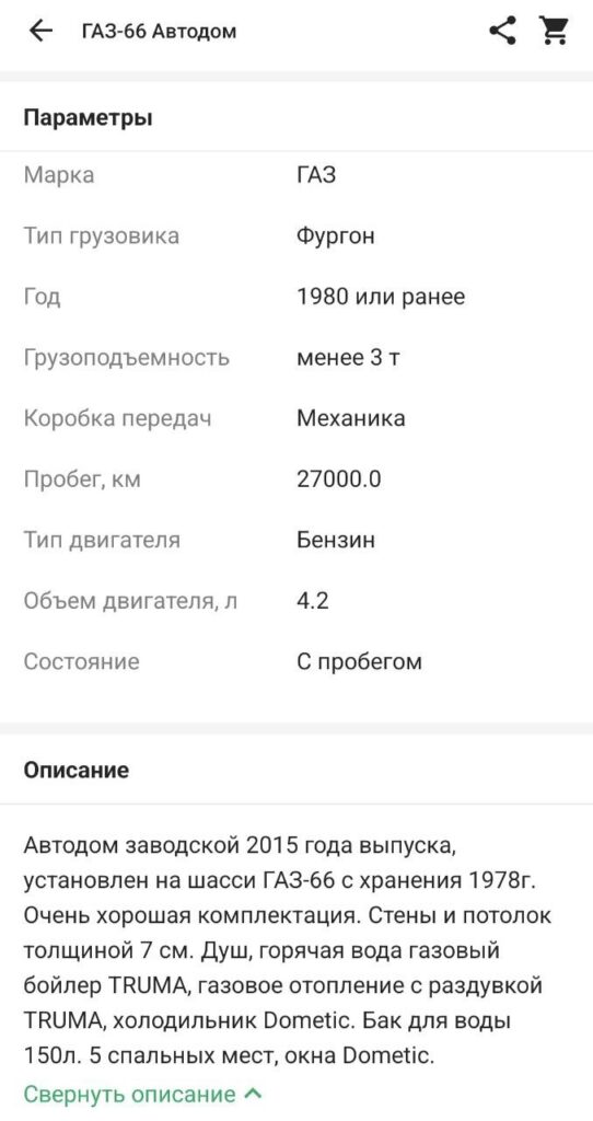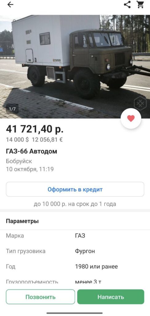 Именно в Бобруйске продается вся эта красота. Как заявляет автор автодом заводской, 2015 года выпуска. Установлен на шасси ГАЗ-66 с хранения 1978 года. Стены и потолок толщиной 7 сантиметров. Имеется душ, горячая вода, газовый бойлер, отопление, холодильник, окна и 5 спальных мест. Пробег у фургона порядка 27000,0. Тип двигателя — бензиновый, объем — 4,2, механика, а грузоподъемность менее трех тонн. Хочет владелец за чудо-автомобиль 14 тысяч долларов или 41 721 белорусскими.