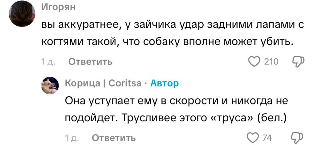 «У зайчика удар задними лапами с когтями такой, что собаку вполне может покалечить», — предостерегают знатоки в комментариях.