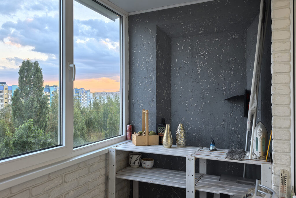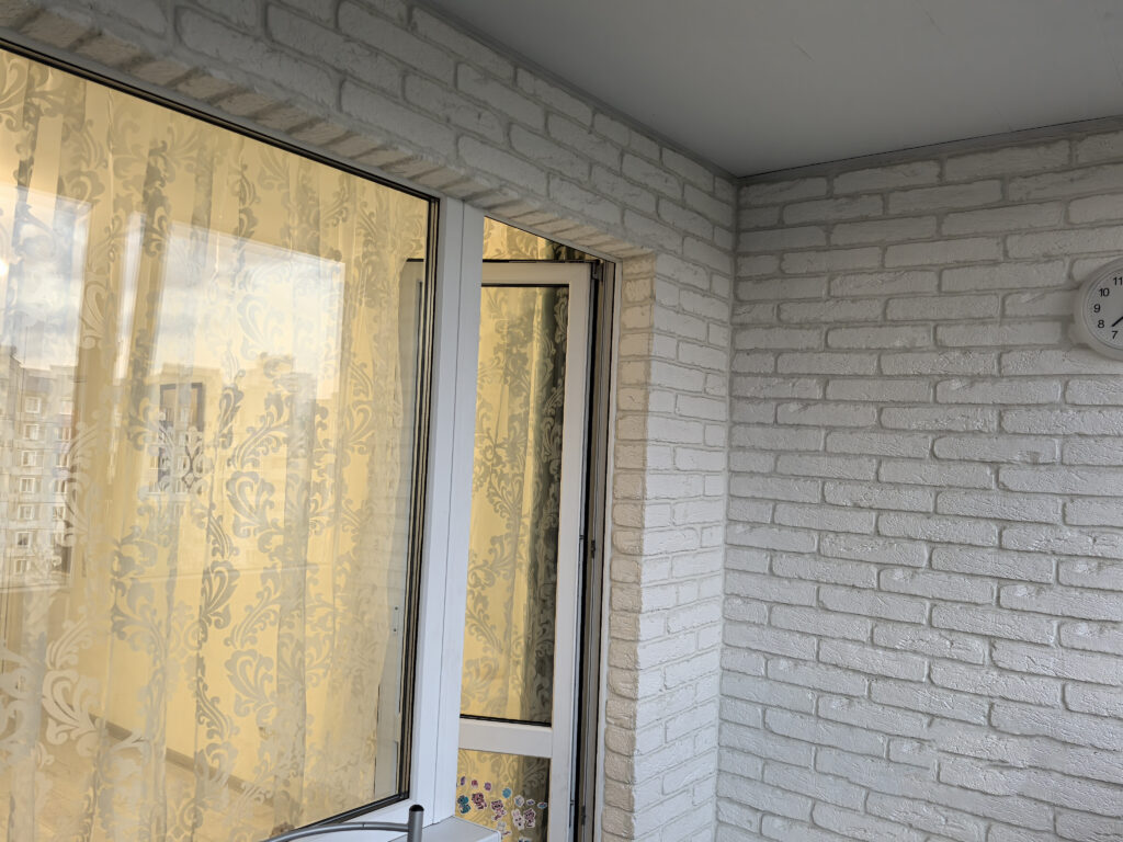 В жилой зоне имеется диван, телевизор и шкафы с симпатичным дизайном, оформленные как выходы на французский балкон. Кухня находится в отдельной комнате, и помимо базовых холодильника и плиты располагает аэрогрилем, кулером с водой и электрогрилем. Балкон утеплен и оборудован зоной отдыха и хранения вещей.