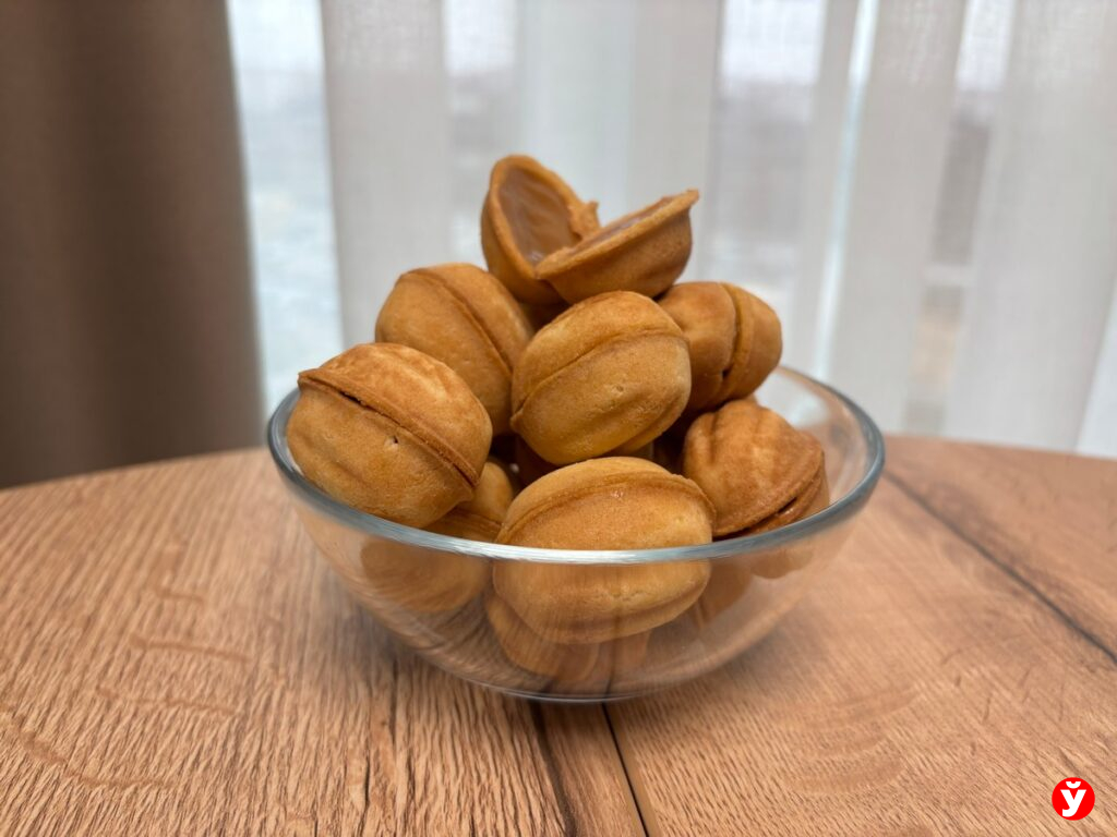 Выпеченные половинки необходимо очистить от лишнего при помощи ножа, ножниц или мелкой тёрки. Затем каждую половинку начинить варёной сгущенкой «Егорка» (по желанию можно добавить настоящие орешки), соединить между собой и наслаждаться вкусом!