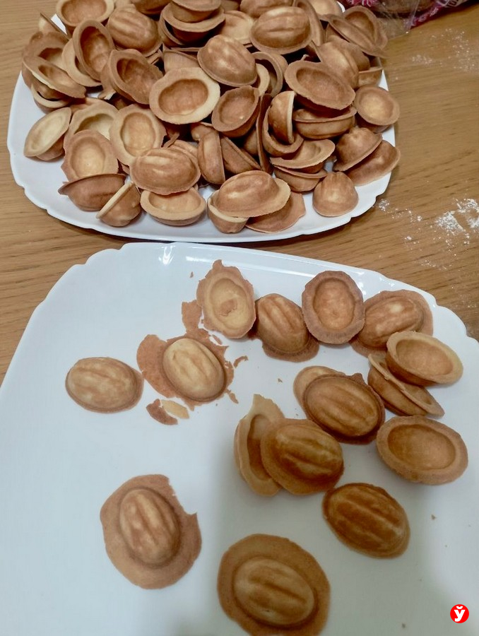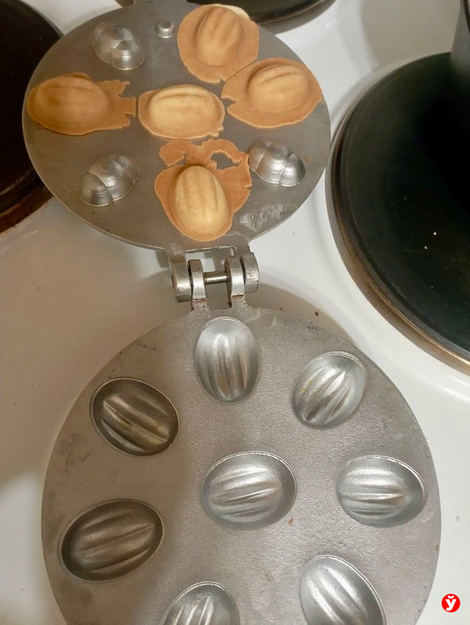 Затем разделить тесто на кусочки от 4 до 7 грамм (зависит от размера формы орешка) и выпекать в разогретой форме.