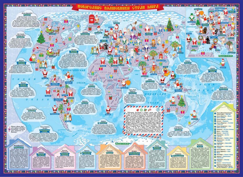 На карте представлены новогодние герои из разных стран с описанием их внешности, традиций и особенностей. С её помощью можно узнать, чем отличаются праздничные персонажи, как их называют в других культурах и какие роли они играют в рождественских и новогодних обычаях.