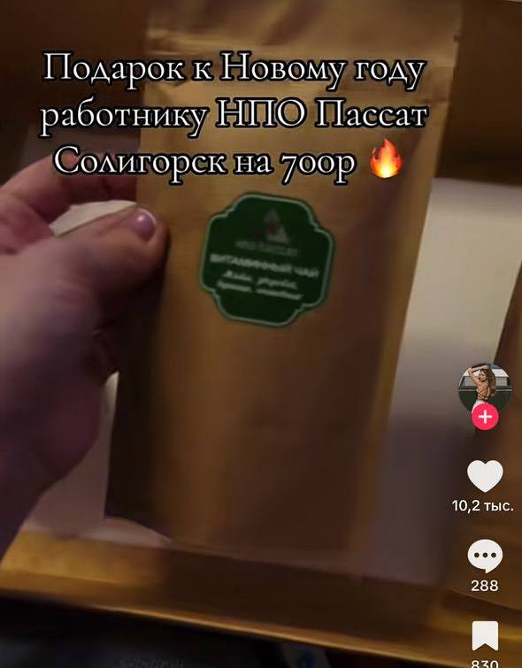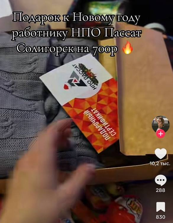 В белорусском TikTok в преддверии Нового года набирает популярность добрая традиция — работники делятся подарками, которые получили на предприятиях. Одно из таких видео вызвало бурное обсуждение: в кадре — аккуратно собранный чемоданчик с новогодним набором для сотрудника ООО «Научно-производственное объединение «Пассат» (Солигорск).
