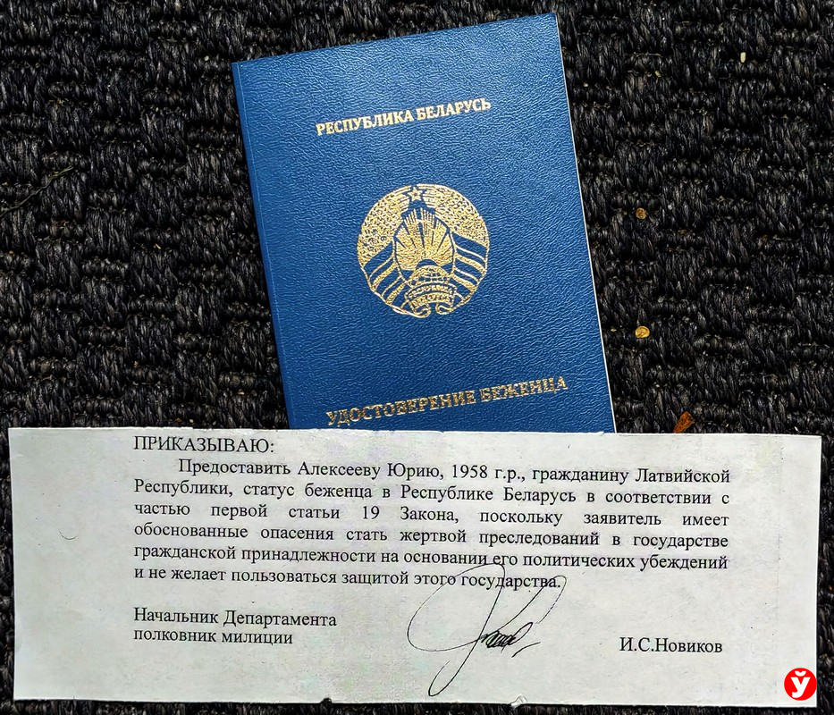 Вместе с удостоверением получаю бумагу: «ПРИКАЗЫВАЮ: Предоставить Алексееву Юрию, 1958 г.р., гражданину Латвийской Республики, статус беженца в Республике Беларусь в соответствии с частью первой статьи 18 Закона, поскольку заявитель имеет обоснованные опасения стать жертвой преследований в государстве гражданской принадлежности на основании его политических убеждений и не желает пользоваться защитой этого государства.
