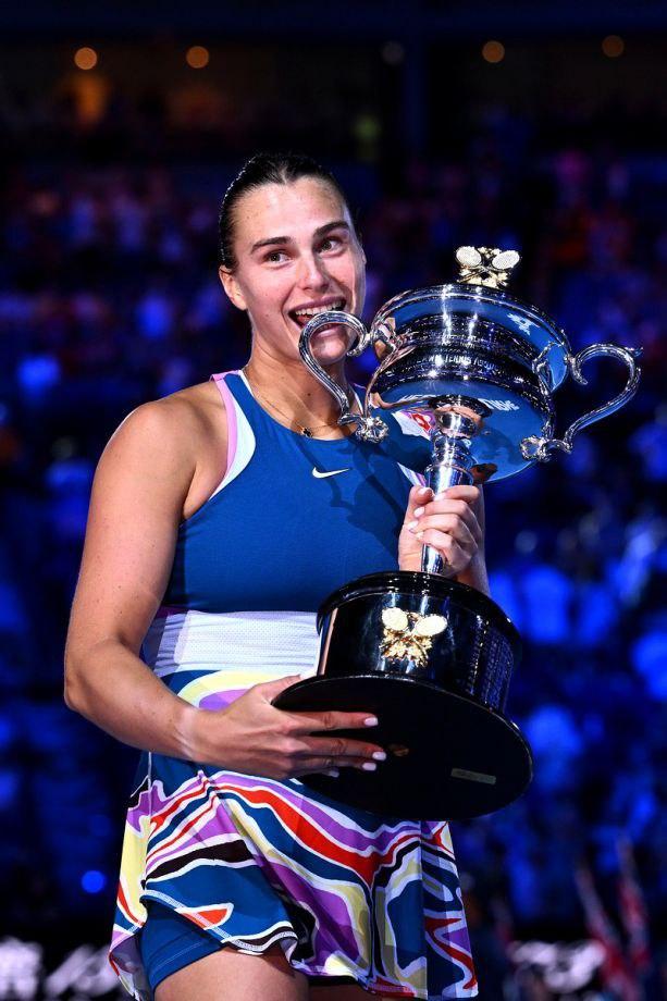 Кубок за победу на первом в сезоне турнире Большого шлема Арине Соболенко вручила легендарная американская теннисистка Билли Джин Кинг.