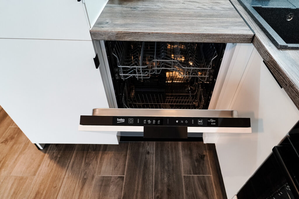 Несмотря на то, что в жилье всего одна жилая комната, ее планировка выполнена очень грамотно — каждая из зон разделена как минимум двумя стенами. В зонах сна и отдыха есть двухспальная кровать, диван, журнальный столик и кресло. Кухонная зона начинается с барного столика с высокими стульями, здесь есть необходимые холодильник и плита, а также посудомоечная и кофемашины. Есть выход на застекленную лоджию с небольшой зоной отдыха.