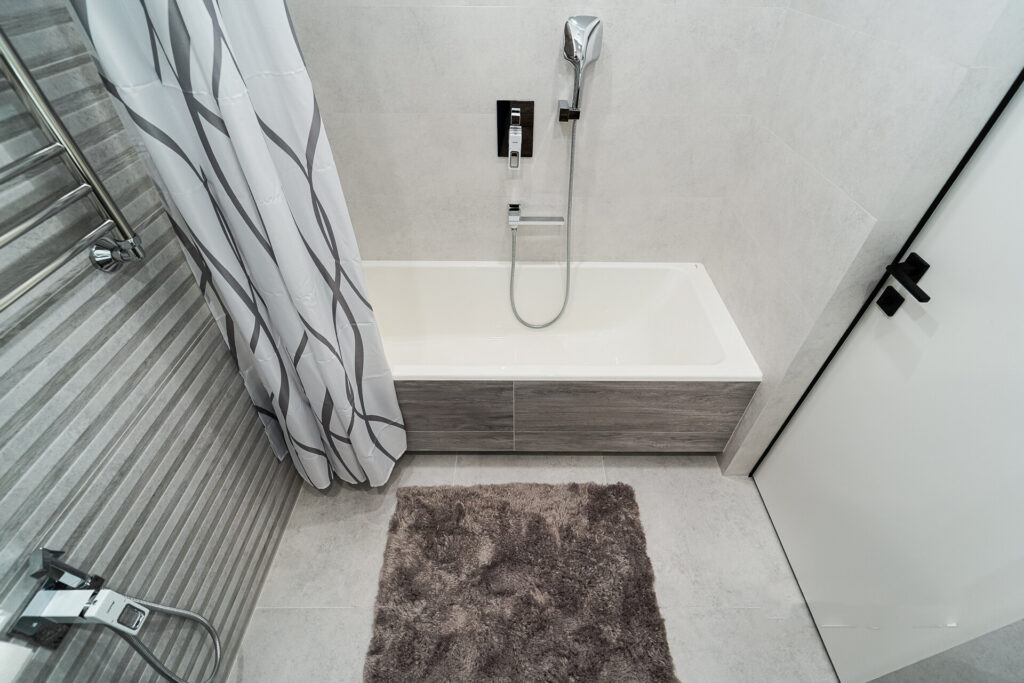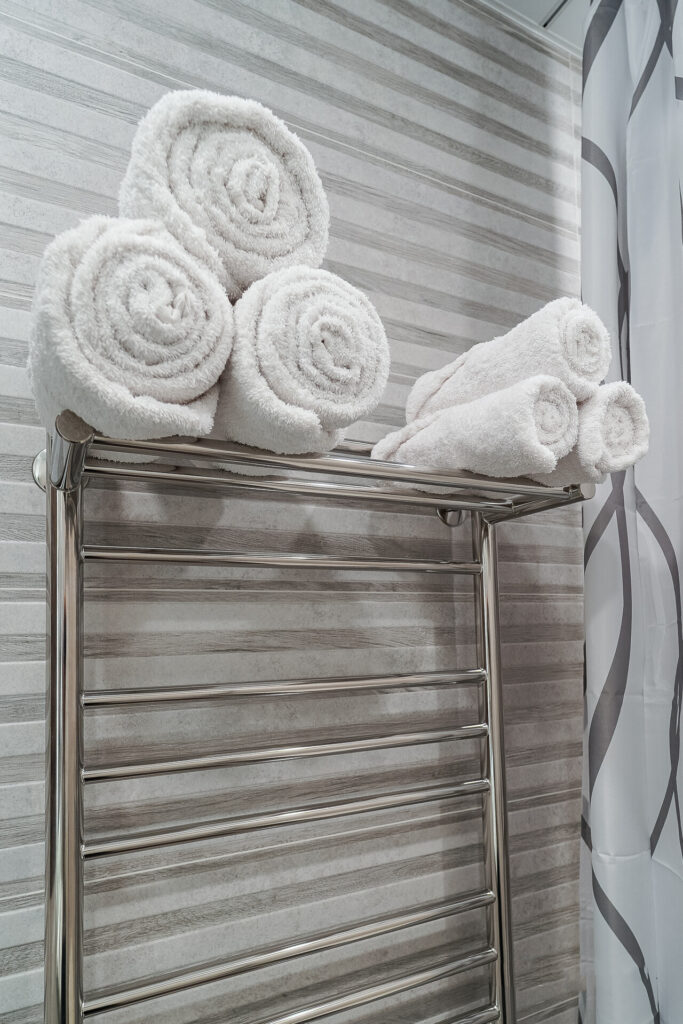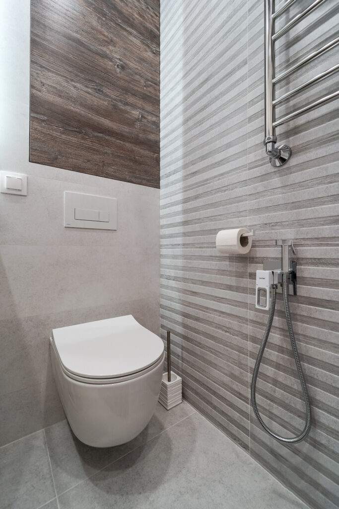 Санузел в квартире совмещенный, но также разделен стенами. Кроме необходимых унитаза и ванны есть полотенцесушитель и гигиенический душ.