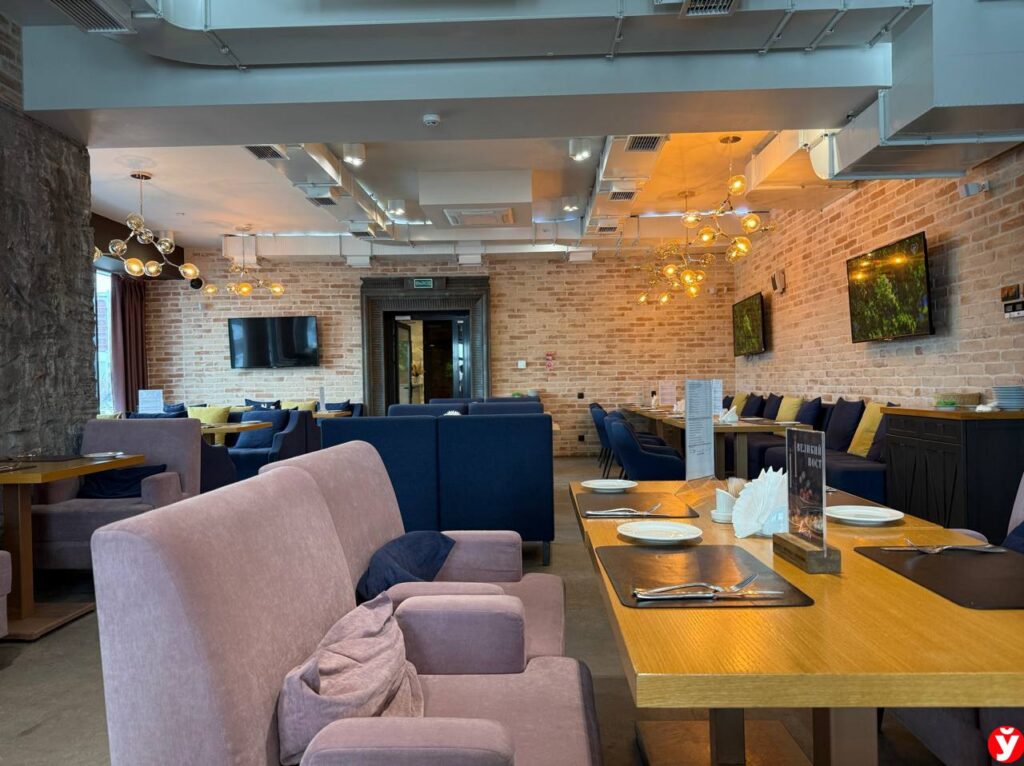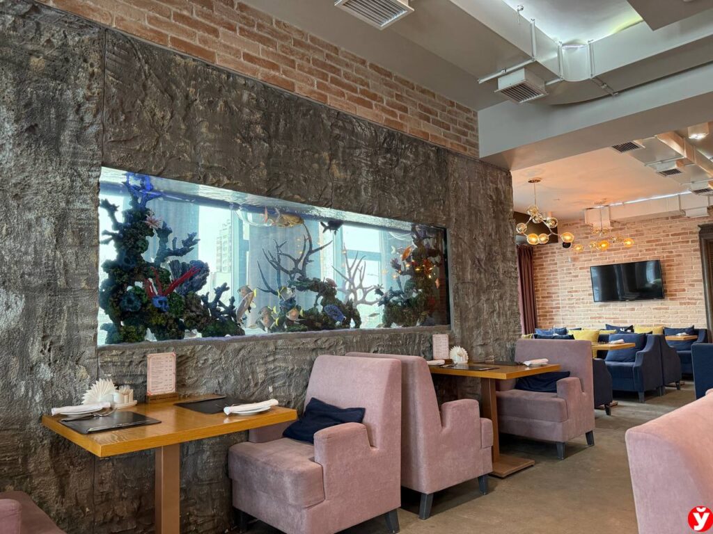 Внутри гостей встречает просторный и светлый основной зал с большим количеством столиков. В зале опрятно, скатерти чистые. Интерьер выглядит стильно и создаёт нужную атмосферу для деловых встреч или торжеств. Центр зала украшает большой аквариум с рыбами.