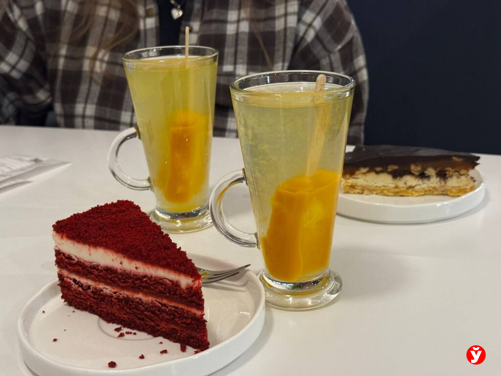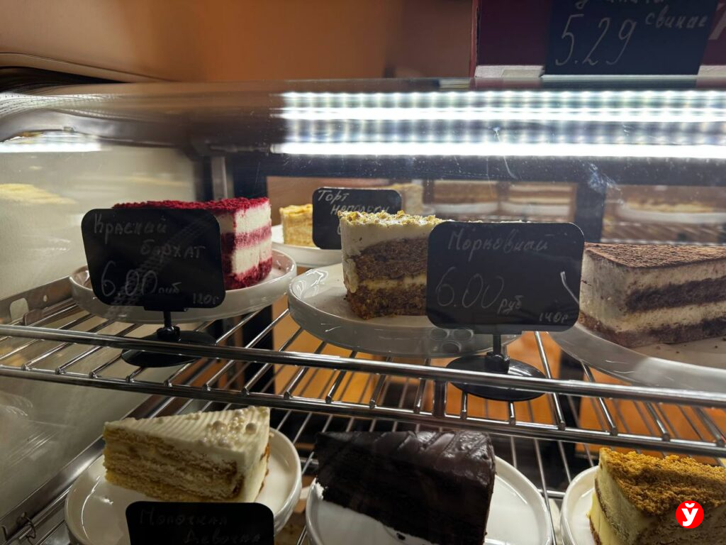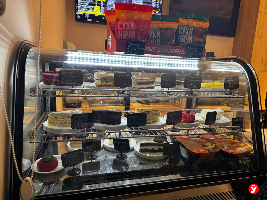 В продаже широкий ассортимент десертов, правда, не собственного производства. Среди них всем знакомые: «Наполеон», «Прага», «Медовик», «Рафаэлло». Средняя цена десерта — 6 рублей. К сладкому угощению предлагают чай или кофе. Цена варьируется в зависимости от объема — от 3 до 6 рублей.