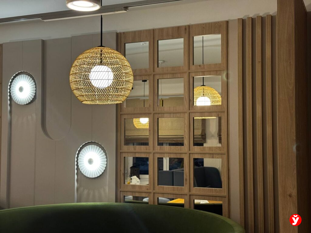 Заведение кофейни небольшое, но благодаря грамотному интерьеру нет чувства скованности. Большие окна, декоративные зеркала на всю стену визуально увеличивают пространство и дают тот самый «воздух», чего зачастую не хватает маленьким заведениям. Весь интерьер выполнен в спокойных бежевых, зеленых, голубых тонах. Добавляют уюта и декорации: вазы с сухоцветами, антуражные фонари и плетеные светильники. Так что дизайну однозначно говорим «да».